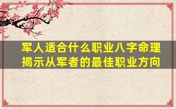 在八字命理中,军人职业的适配性通常与命局中的“刚强”“纪律”“胆识”“领导力”等特质相关。以下是从命理角度分析军人适合的职业方向及对应的八字特征: