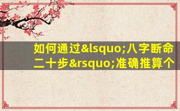 “八字断命二十步”是一种基于中国传统命理学(四柱八字)的推命方法,通过分析个人的出生年、月、日、时(共八个干支)来推断命运走势。以下是结合传统命理学的二十步关键操作流程,供参考学习: