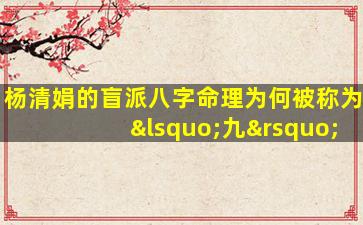 关于“杨清娟的盲派八字命理被称为‘九’”的说法,目前公开的命理学术资料和杨清娟本人的著作中并未明确提及这一称谓的起源或具体含义。不过,结合盲派命理的传统和数字在命理学中的象征意义,可以尝试从以下几个方面推测其可能的缘由: