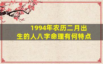 根据1994年农历二月(公历约3月12日至4月10日)出生者的八字命理,其特点需结合具体出生日期和时辰推算,但可基于年柱、月柱及甲戌年干支关系分析共性特征: