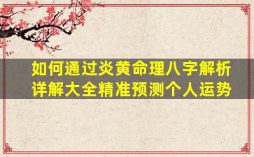 通过炎黄命理八字解析个人运势是中国传统命理学中的重要方法,其核心是通过分析个人出生时的年、月、日、时四柱(共八个字)的天干地支组合,结合五行生克、十神关系等理论,推断命运趋势。以下是分步骤的详细解析方法: