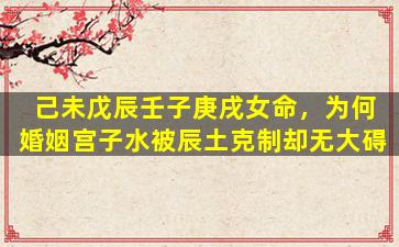 在八字命理中,婚姻宫(日支)的,状态确实会 🦁 影响婚姻运势但需结合全局分析。您(提到的女命己未、戊、辰、壬)子,庚戌日支子水被月 🦊 支辰土克制却无大碍可能有以下原因: