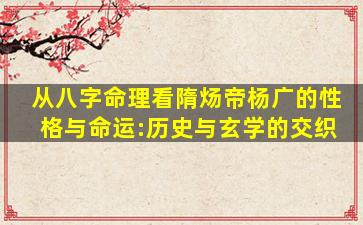 隋炀帝杨广(569—618年)作 🦉 为中国历史上极具争议的帝王,其性格的复杂性、命,运的悲剧性与历史评价的两极化使得 🐘 从八字命理角度解读其人生颇具探究价值。以,下,结合历史记载与命理学逻辑尝试重构杨广的八 🐛 字特征并分析其性格与命运的关联性:
